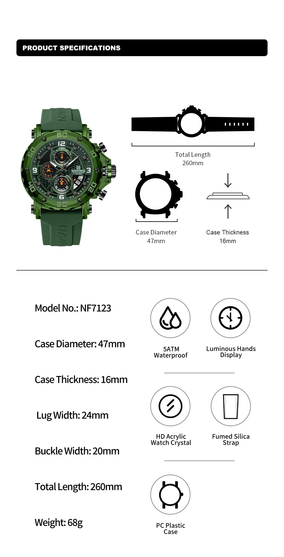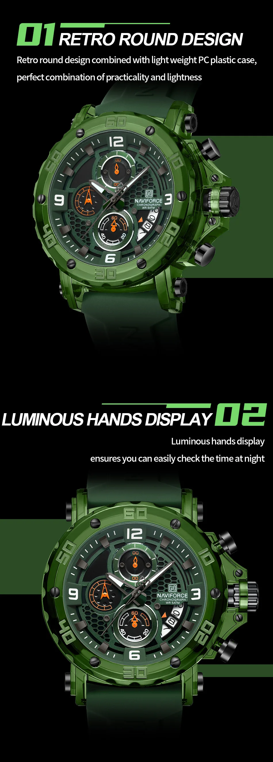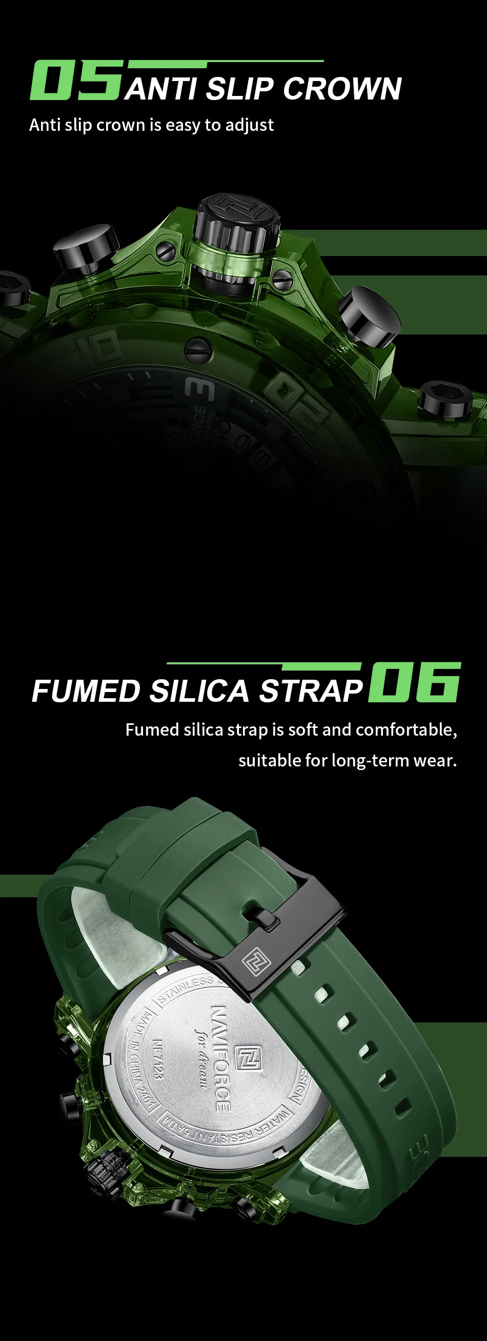✓ All-day comfort — Flexible green silicone strap that breathes and moves with your wrist